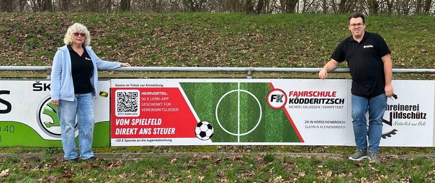 „Fahrschülerinnen und Fahrschüler aus dem Verein, die sich jetzt neu anmelden, bekommen von uns die Lern-App im Wert von 50,00 Euro geschenkt“, sagte Inhaberin Heike Ködderitzsch, die jetzt gemeinsam mit Ihrem Mitarbeiter Alexander Lutzner die schicke neue Werbebande im Sportpark einweihte. „Die Mädels und Jungs dürfen daher auch gerne im SV-Glehn-Trikot zur Anmeldung vorbeikommen“, sagt Ködderitzsch, die in ihrer Jugendzeit selbst für die Damen des VfR Büttgen die Fußballschuhe schnürte.